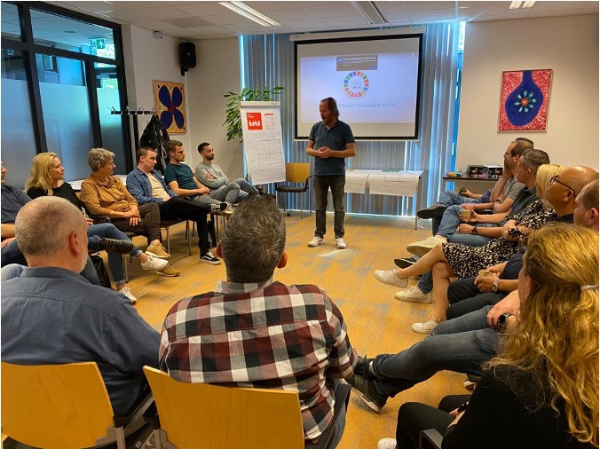 Zet de bijdrage om in acties, zodat het ook echt zal gaan gebeuren. Niet alleen acties door eigen personeel, maar ook leveranciers, overheden en klanten. Zet samen de stappen die nodig zijn. Gebruik de SDG's hierbij als het kompas dat jullie organisatie door (ingrijpende) vernieuwingen leidt.