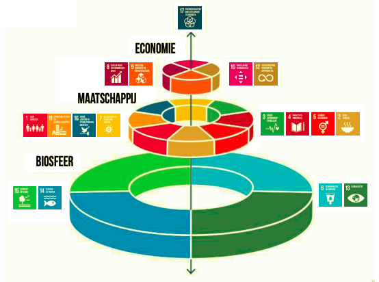 Je kan de 17 doelen zien als een soort bruidstaart met drie lagen, waarvan de biosfeer de onderste laag is. Daarboven de maatschappij en de economie als bovenste laag. Als de biosfeer niet beschermd wordt, kunnen de doelen uit de lagen daarboven ook niet behaald worden.