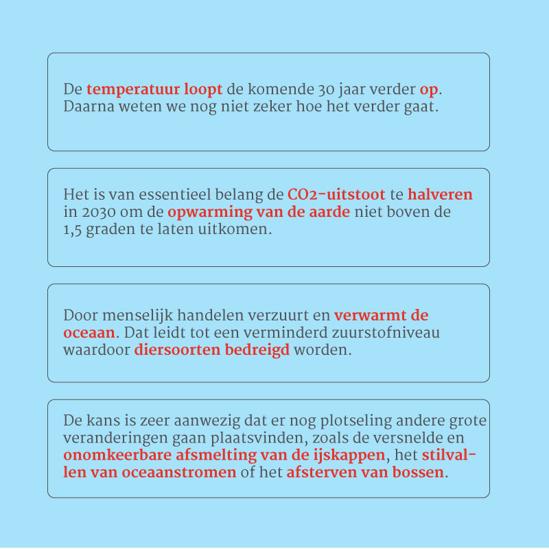 Vooraanstaande klimaatexperts van het Intergovernmental Panel on Climate Change (IPCC) deden in opdracht van de Verenigde Naties onderzoek naar ons klimaat. De uitkomst was alarmerend. In het rapport van het IPCC staat onder andere het volgende: